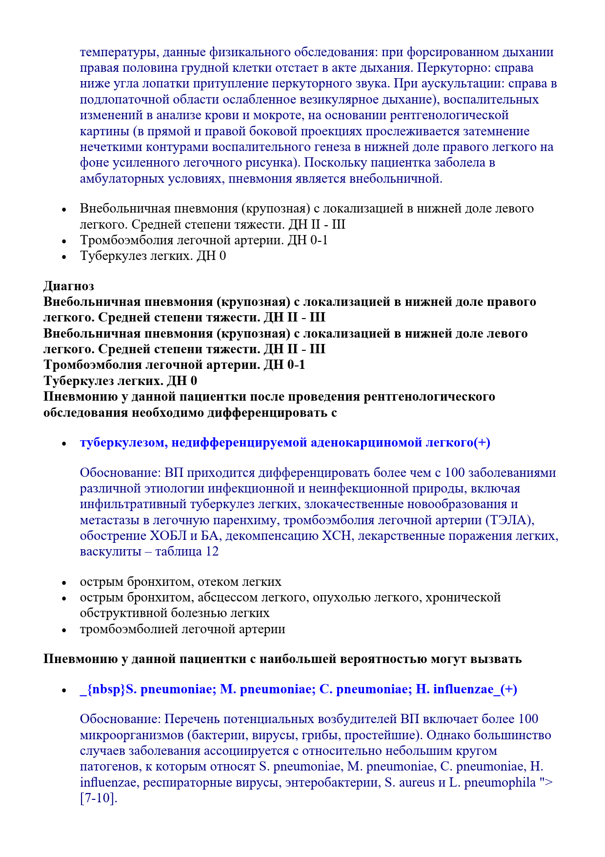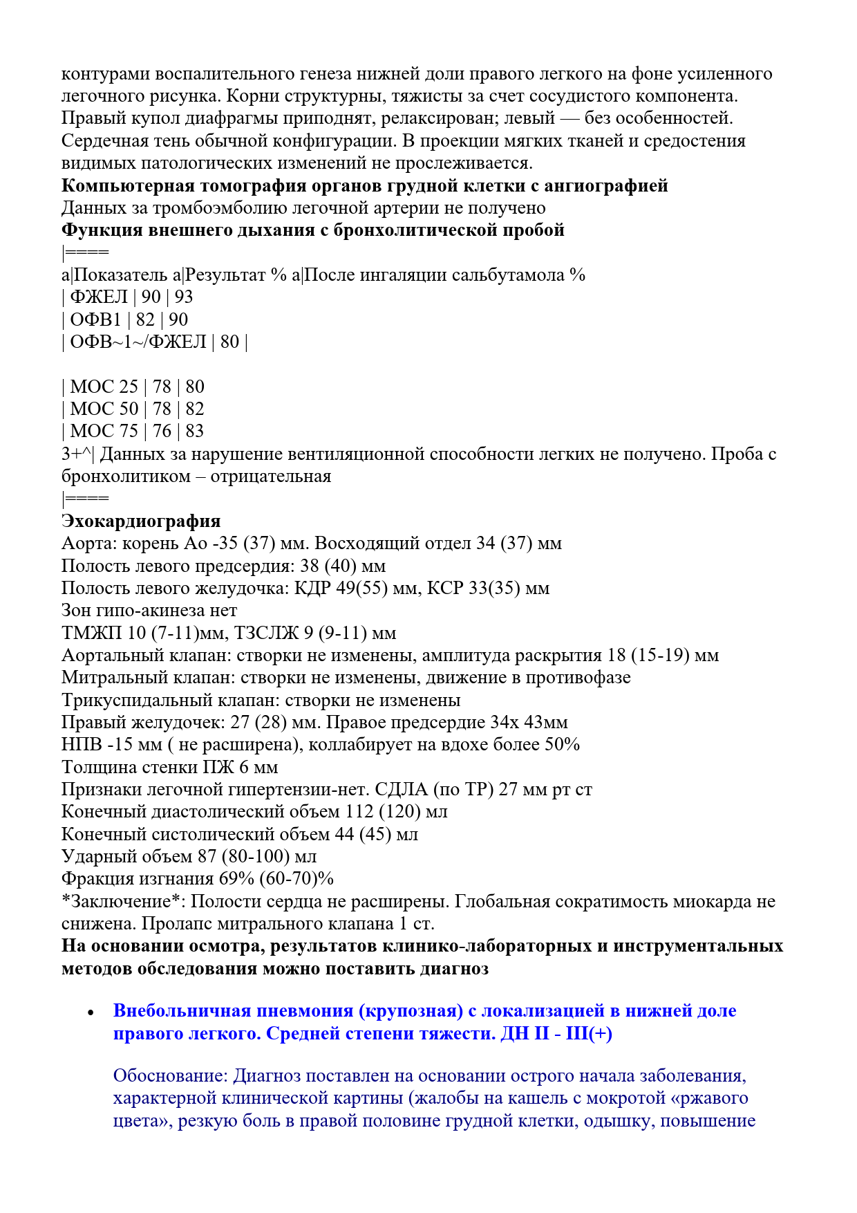 * На фоне самолечения одышка усилилась, кашель стал с мокротой «ржавого цвета», со вчерашнего дня стала ощущать боль в грудной клетке, температура повысилась до фебрильных цифр, появилась выраженная слабость, потливость.