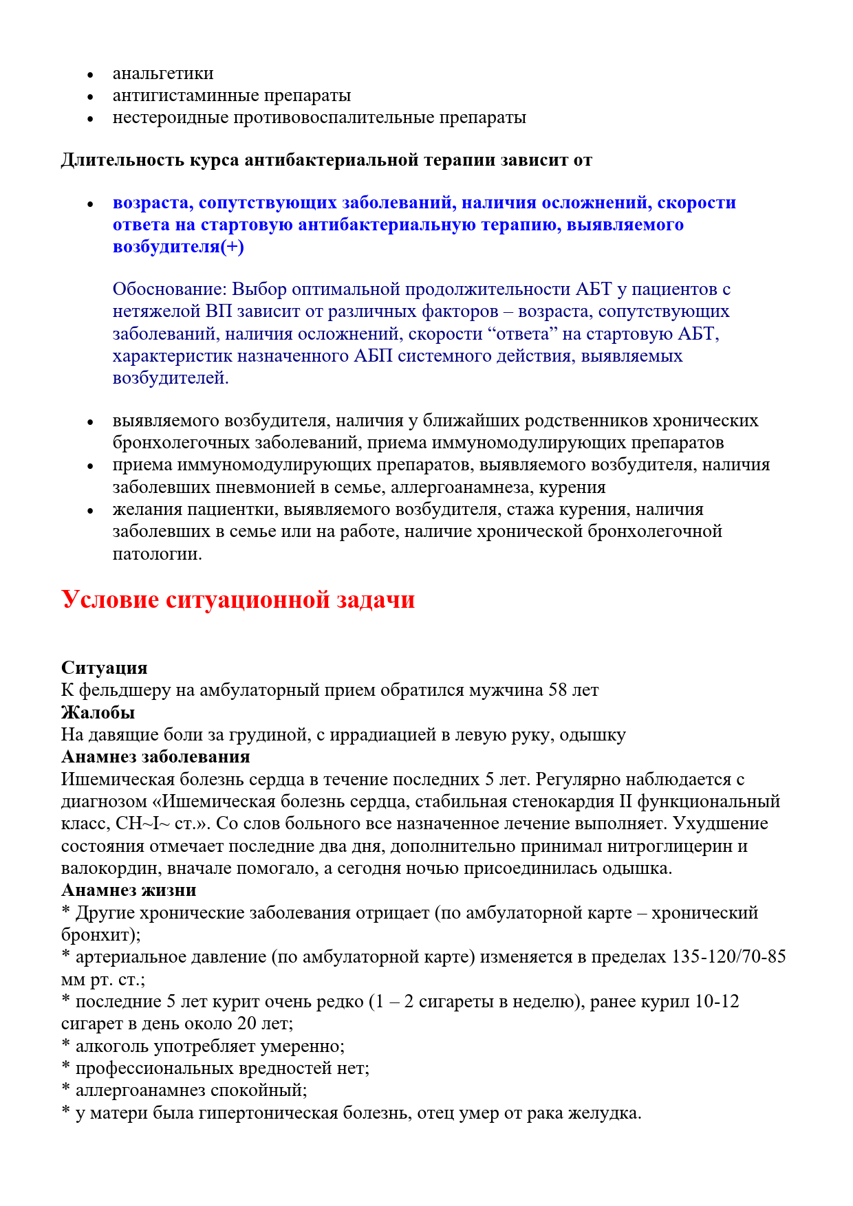 Ишемическая болезнь сердца в течение последних 5 лет. Регулярно наблюдается с диагнозом «Ишемическая болезнь сердца, стабильная стенокардия II функциональный класс, СН~I~ ст.». Со слов больного все назначенное лечение выполняет. Ухудшение состояния отмечает последние два дня, дополнительно принимал нитроглицерин и валокордин, вначале помогало, а сегодня ночью присоединилась одышка.